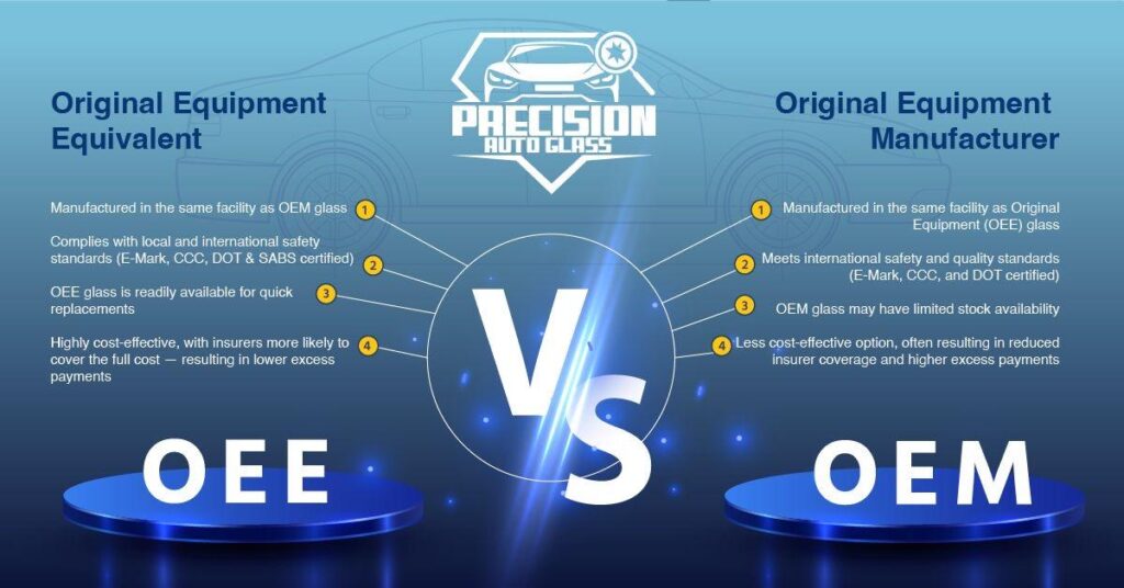 At Precision Auto Glass, we use Original Equipment Equivalent (OEE) glass. OEE glass meets the exact same rigorous safety and quality standards as Original Equipment Manufacturer (OEM) glass.